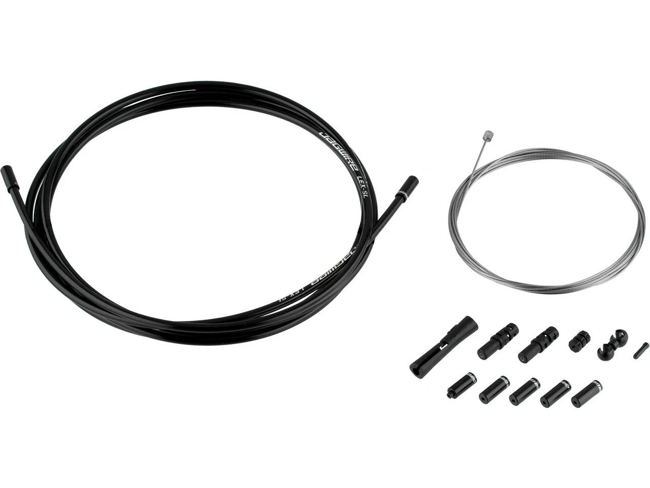 1 x câble de vitesses Jagwire STS 2300 mm pour Shimano/SRAM1 x gaine de câble Jagwire LEX-SL 2200 mm avec doublure Jagwire Slick-Lube6 x capuchons Jagwire scellés1 x capuchon Jagwire Hooded1 x embouts Jagwire Cable Tip1 x protège-cadres Jagwire 5G Tube Top3 x protège-cadres (donuts de câble) Jagwire Cable Donut1 x crochet rotatif Jagwire