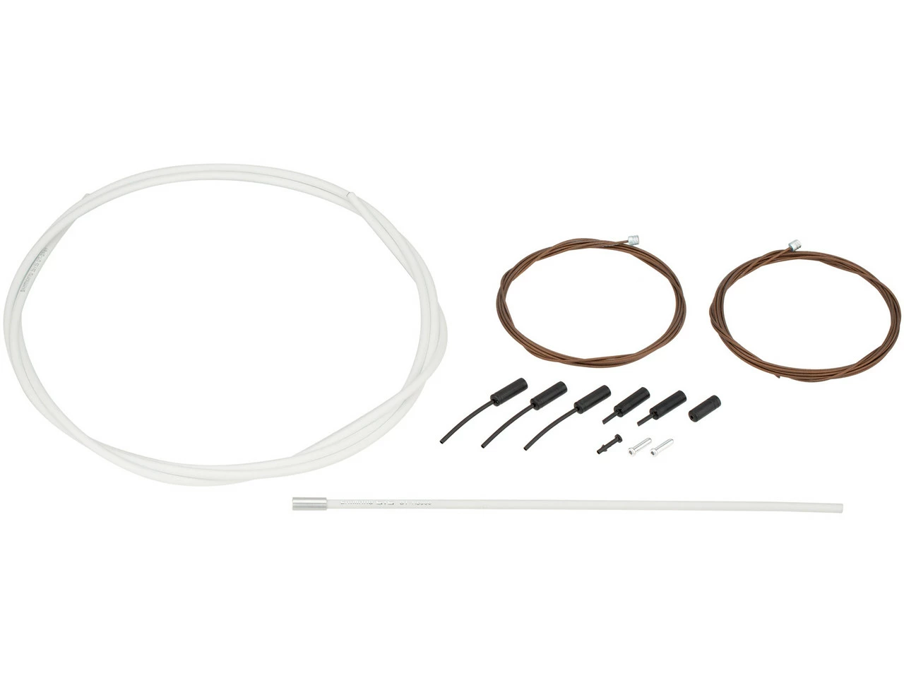 Numéros du fabricant :noir:Y-0BM98010hi-tech gris:Y-0BM98040blanc:Y-0BM98020rouge:Y-0BM98030Contenu :1 x gaine de câble de vitesses Shimano OT-RS9001 x gaine de câble de vitesses Shimano OT-SP411 x câble de vitesses Shimano 1800 mm1 x câble de vitesses Shimano 2100 mm2 x douilles à pointe courte pour ST-R9100/R91203 x douilles à pointe longue1 x douille scellée pour le dérailleur arrière2 x capuchons de câble1 x capuchon de dérailleur arrière1 x douille pour dérailleur avant pour un câblage entièrement externe
